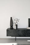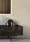 In his quest to add movement to the surface, our designer Alain van Havre started layering and combining triangular shapes. Before he knew it, he had created an interesting composition out of teak. We ended up brushing the surface to highlight the grain and further emphasize the feeling of motion. Originally used for our popular Teak Graphic sideboard, the pattern now translates perfectly to a TV cupboard.