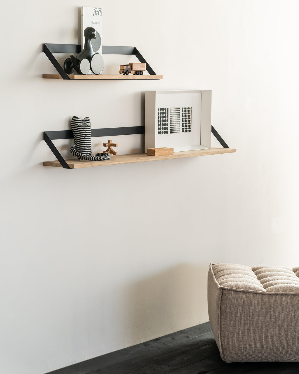 The Oak ribbon wall shelf by Studio Kaschkasch impresses through its simplicity. It's a free and easy shelf combining beautiful oak wood and a metal hanging system. Whether you hang only 1 or a dozen, this functional shelf is compatible in so many different interiors due to its accessible look.
