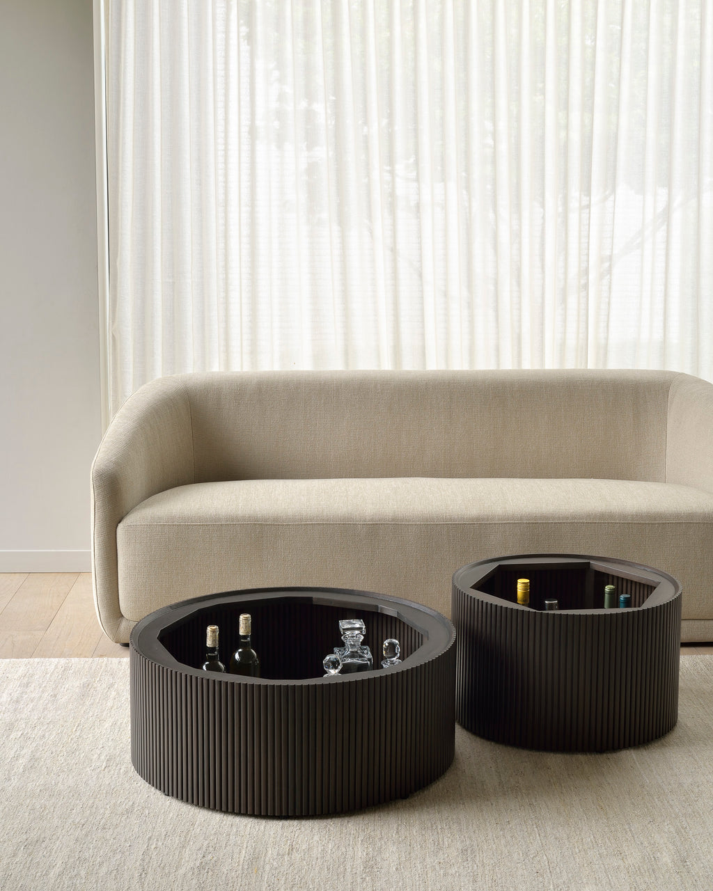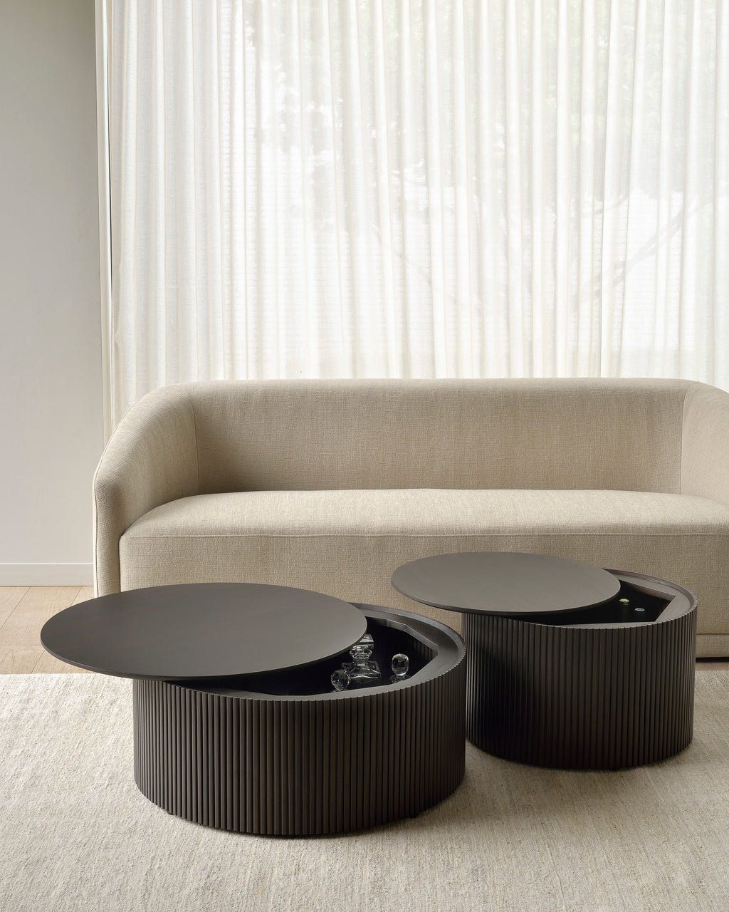 Designed by Jacques Deneef, the Roller Max is a clever multifunctional item that combines a coffee table with storage. Encapsulated in its stacked wood-stick effect, the tabletop can be easily removed to hide the newspapers, toys, cushions and throws from daily life. The perfect solution for smaller living.