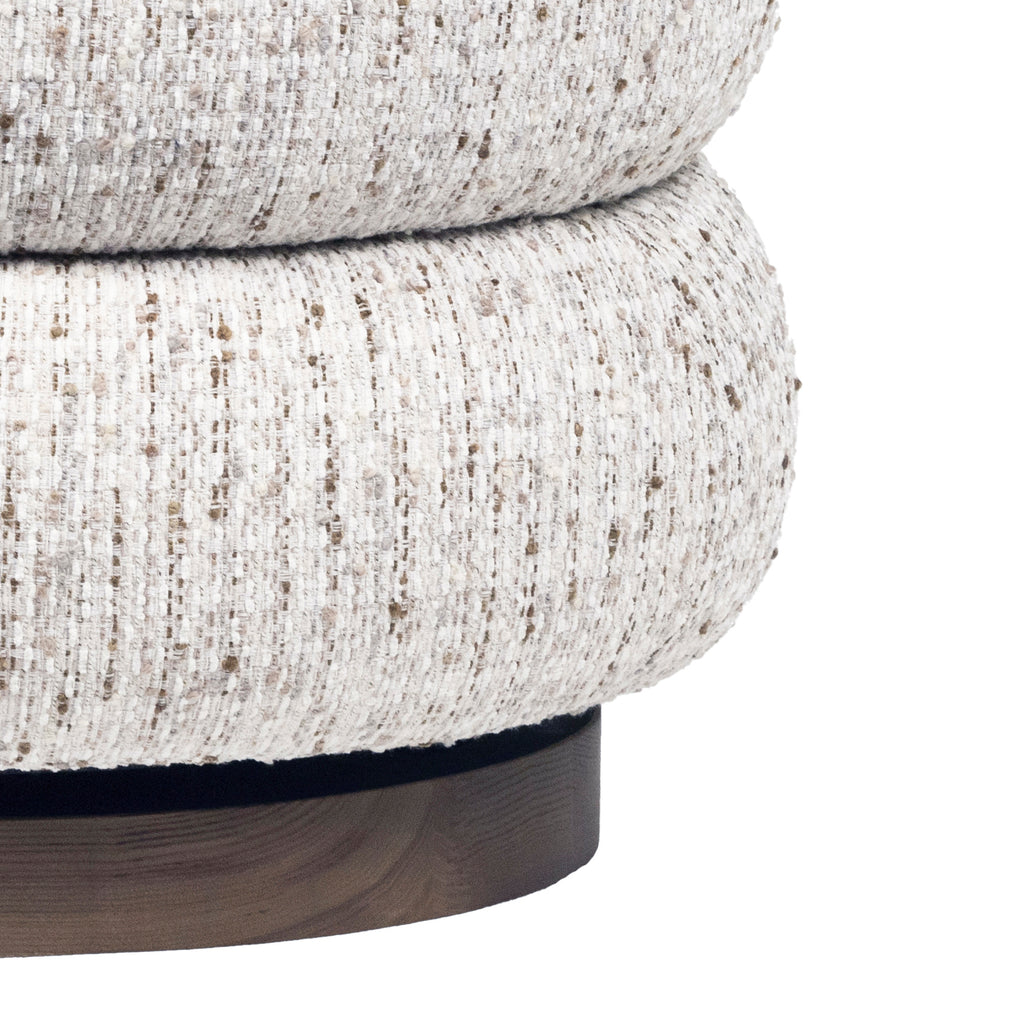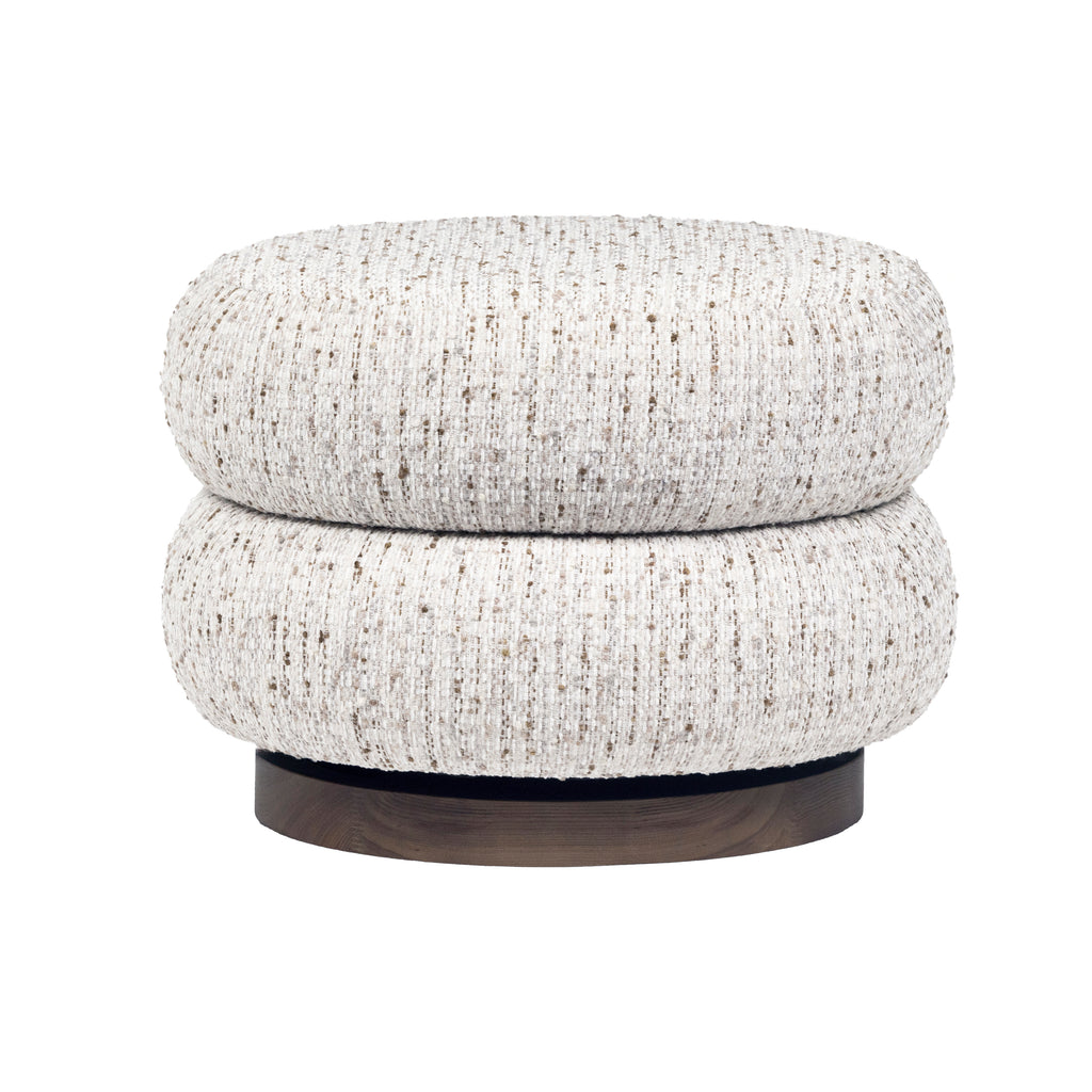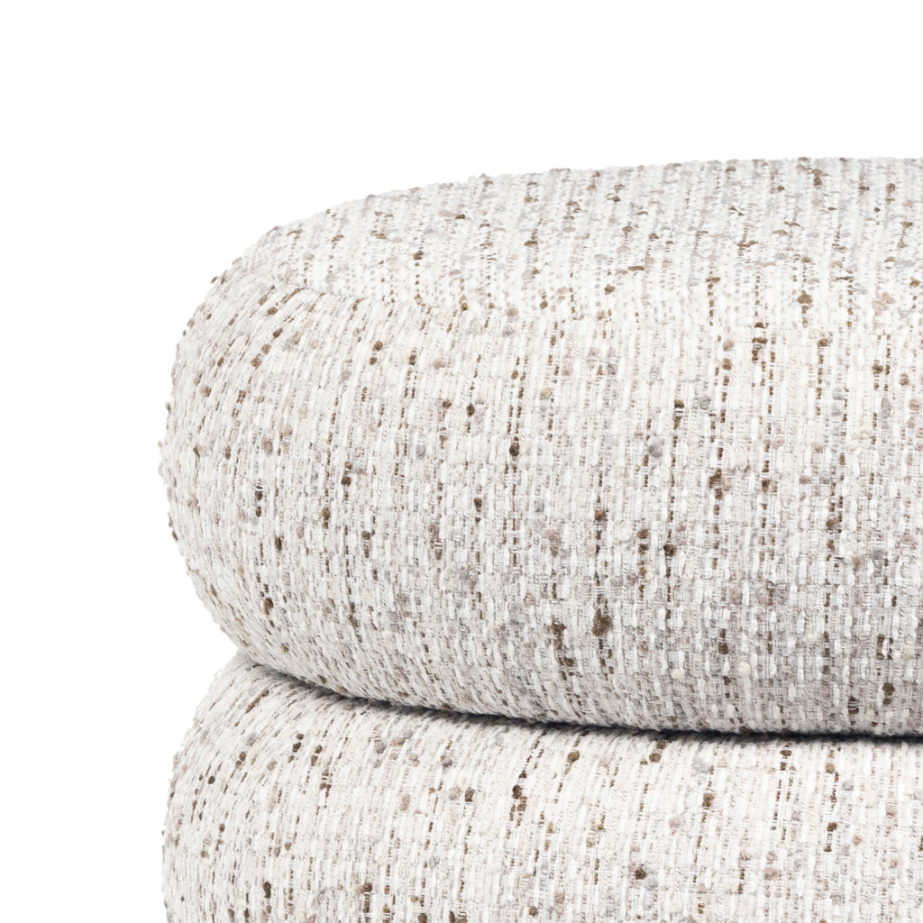 The Jude Ottoman blends soft, rounded forms with a rich, textured fabric for a refined yet inviting look. Its stacked silhouette adds visual interest, while the warm tones bring depth and character to any space. Anchored by a sturdy wood base, this ottoman serves as a functional accent. Perfect as a footrest, extra seating, or a sculptural statement piece.
