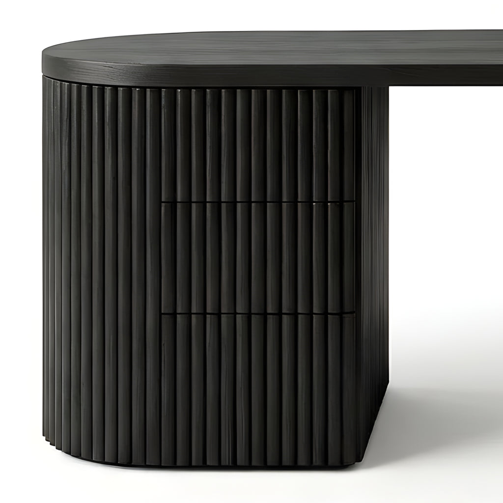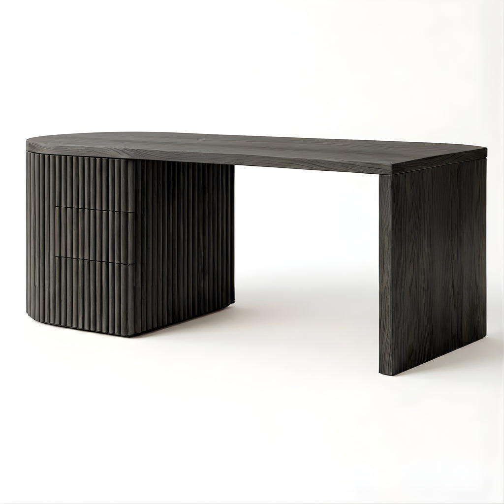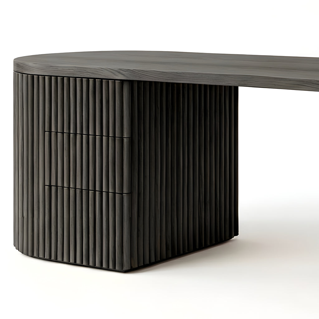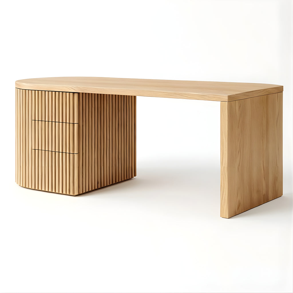 The Piper Presidential Desk commands attention through refined scale and sculptural detail. Its generous curved top flows into a fluted drawer unit, grounding the form with rhythm and visual weight. A seamless return offers ample surface space for creative or executive use, while integrated drawers keep the workspace effortlessly ordered. Thoughtfully proportioned and beautifully balanced, this desk invites a slower, more intentional approach to the workday.