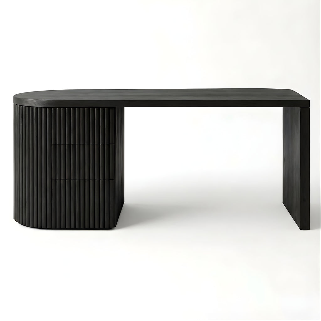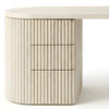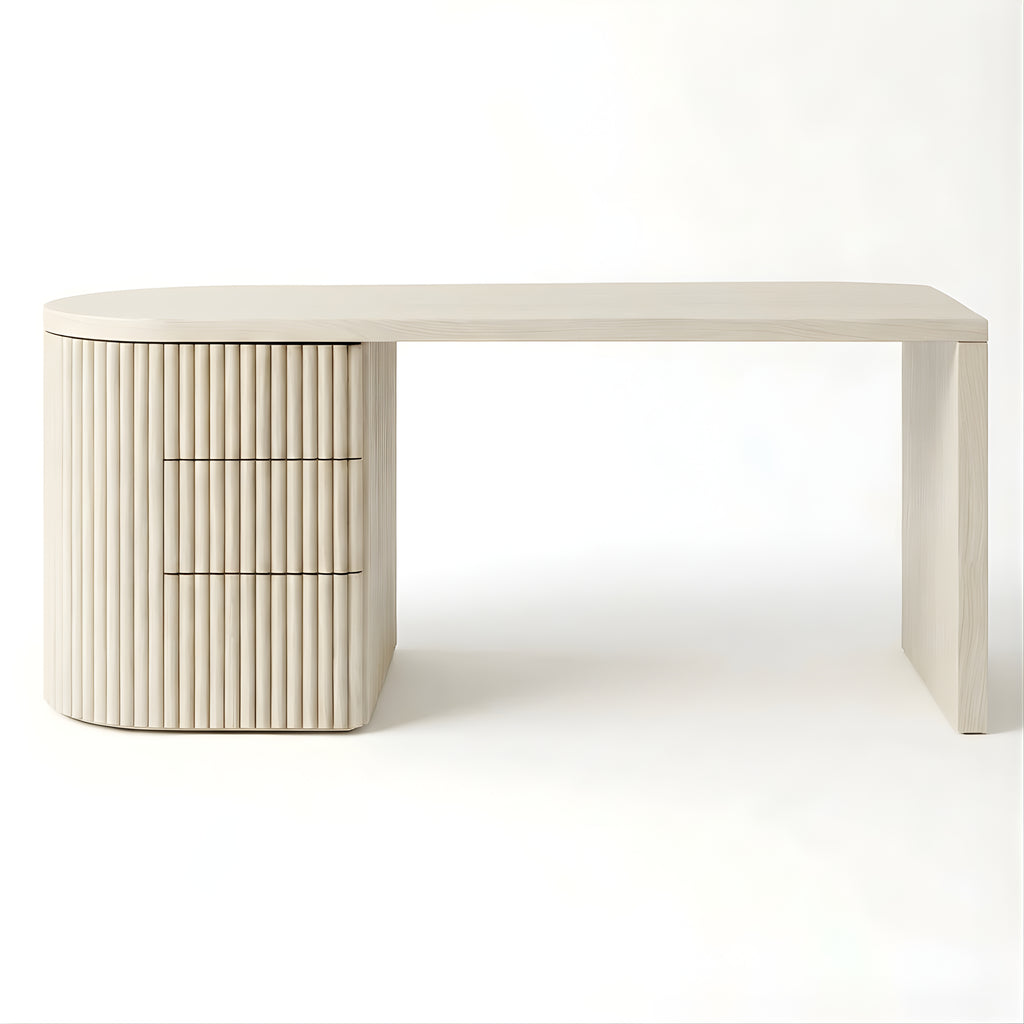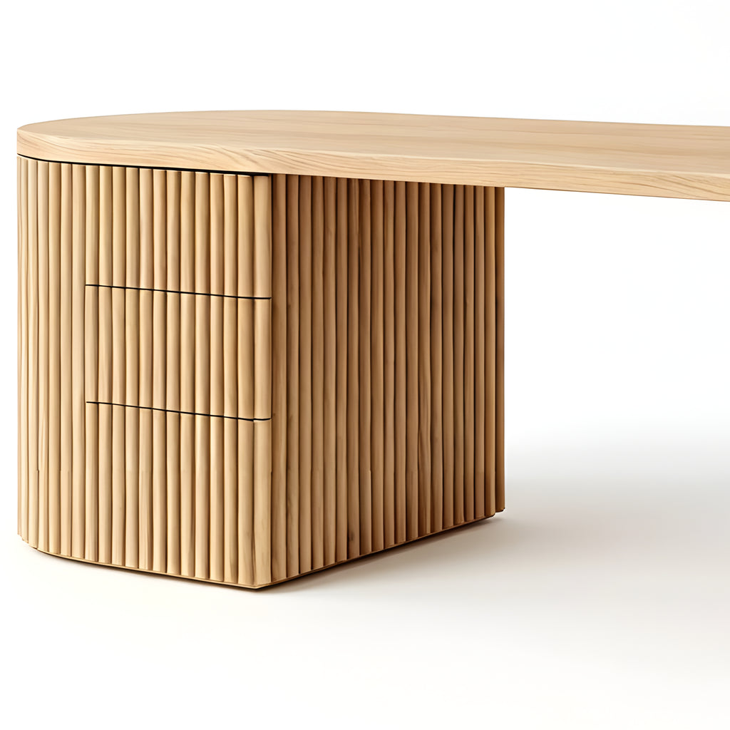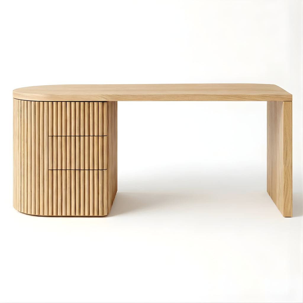 The Piper Presidential Desk commands attention through refined scale and sculptural detail. Its generous curved top flows into a fluted drawer unit, grounding the form with rhythm and visual weight. A seamless return offers ample surface space for creative or executive use, while integrated drawers keep the workspace effortlessly ordered. Thoughtfully proportioned and beautifully balanced, this desk invites a slower, more intentional approach to the workday.