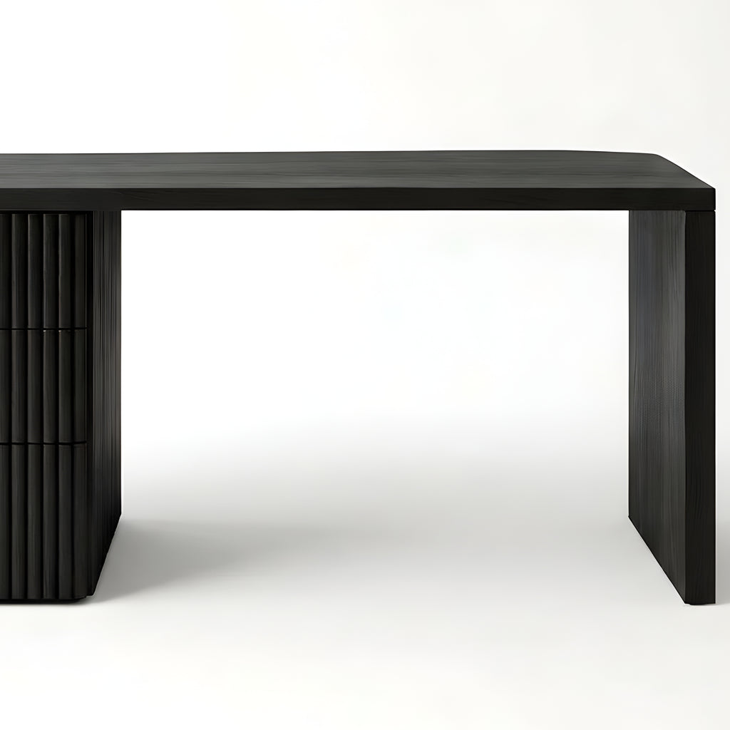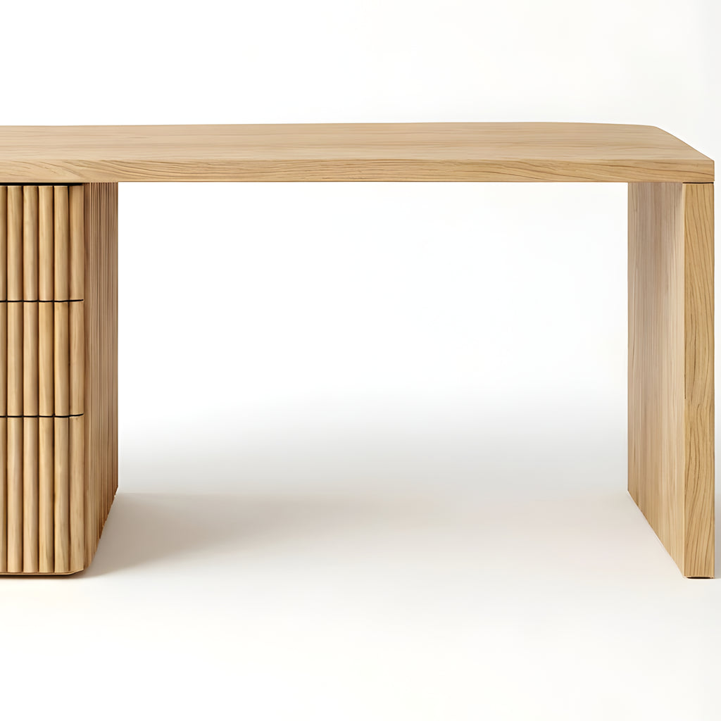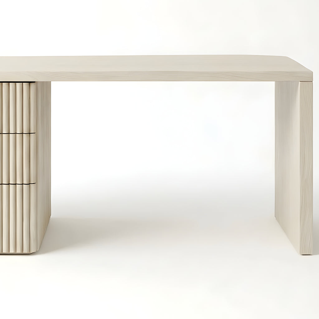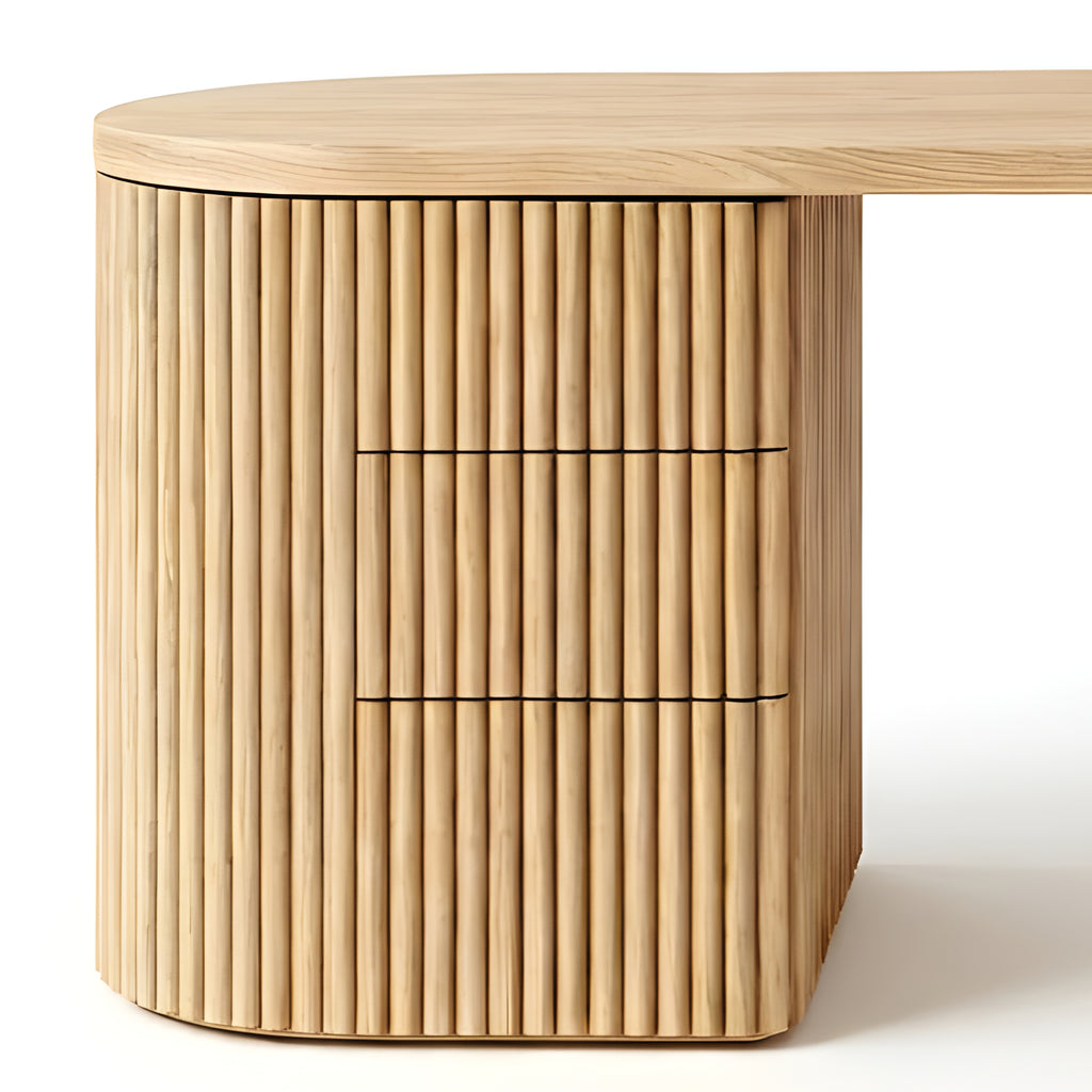 The Piper Presidential Desk commands attention through refined scale and sculptural detail. Its generous curved top flows into a fluted drawer unit, grounding the form with rhythm and visual weight. A seamless return offers ample surface space for creative or executive use, while integrated drawers keep the workspace effortlessly ordered. Thoughtfully proportioned and beautifully balanced, this desk invites a slower, more intentional approach to the workday.