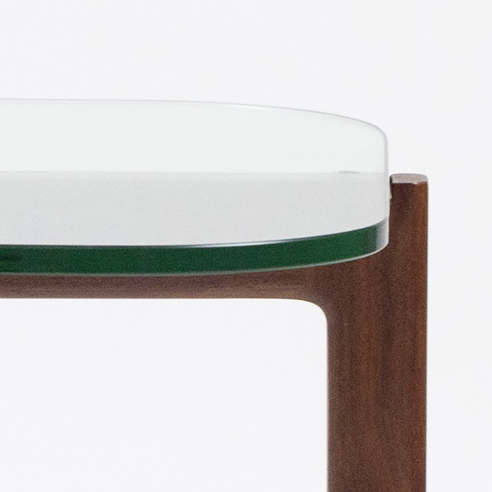 The Quarry Side Table is a minimalist take on casual sophistication. Contrasting materials reveal the striking combination of glass and wood grain. The glass top has rounded corners to soften the look, and the eye-catching, solid-wood cross base reinforces this aesthetic with rounded edges and elegant joinery details.